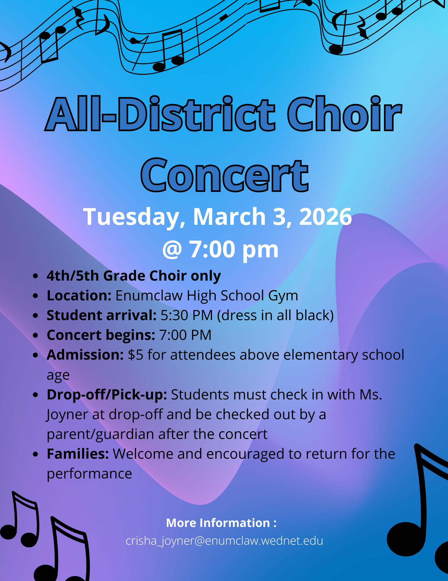 March is an exciting month at Black Diamond Elementary, and we have several events to look forward to! On Friday, March 6th, we invite you to join us for Donuts with Grown-Ups from 8:00–8:45 a.m. This is a great opportunity to start the day with connection, conversation, and community. Please note that parents and guardians must stay with their student during this time, as supervision will not be available until 8:45 a.m. We are also thrilled for our 5th grade students as they participate in the 5th Grade Music Experience on Tuesday, March 24th. During this event, students will have the opportunity to try out a variety of instruments and enjoy performances by the orchestra, band, and choir giving them an exciting glimpse into future music opportunities.