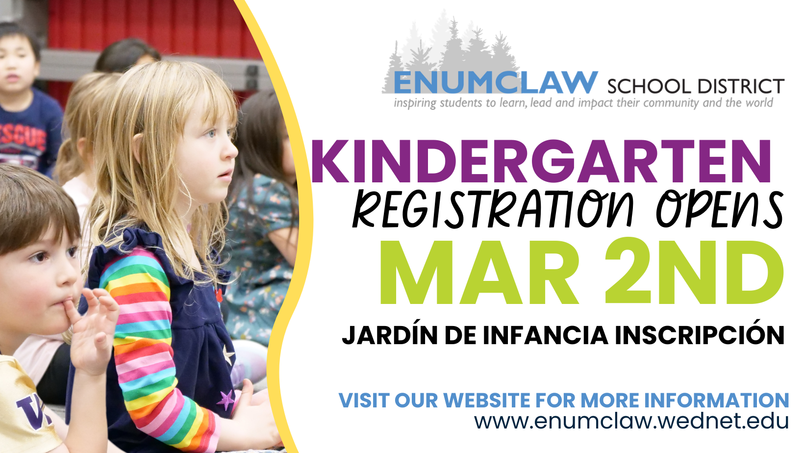 Enumclaw School District offers a full-day kindergarten program at no cost to parents. Registration for new kindergarten students begins March 2, 2026. Please register your upcoming kindergarten students using our website: https://www.enumclaw.wednet.edu/page/enrollment-information