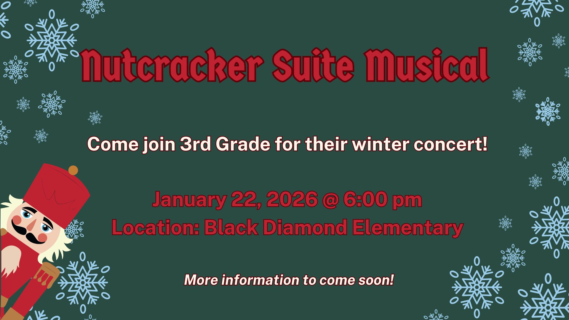 December 19 - PTO Family Game Night 5:30pm - 7:00pm December 22 - January 2 - Winter Break, No School January 8 - PTO Meeting, 4:00pm January 19 - Martin Luther King Jr. Day, No School January 22 - 3rd Grade Winter Concert, 6:00pm January 23 - PTO Popcorn Friday January 30 - PTO Glow Dance 5:30pm to 7:00pm |