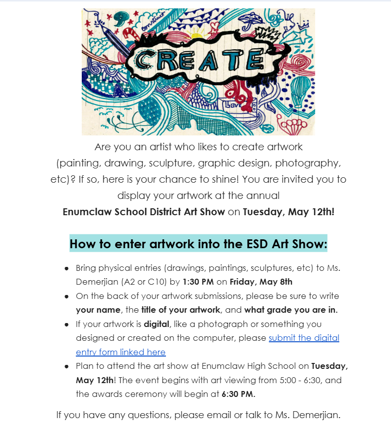 - May 12: ESD Art Show in EHS Commons 5:00pm-7:00pm