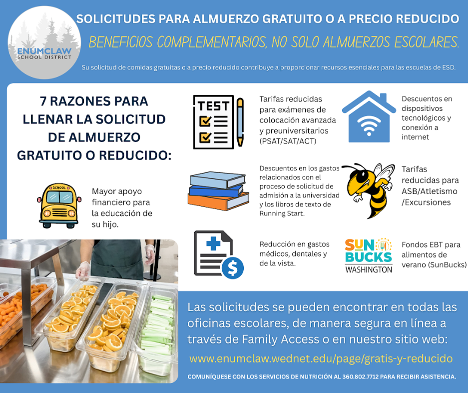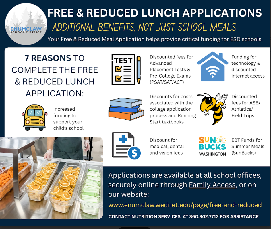 Free/Reduced Meal applications can be found at https://www.enumclaw.wednet.edu/o/esd/page/free-and-reduced We encourage all families to fill out this form, even if you think you may not qualify.