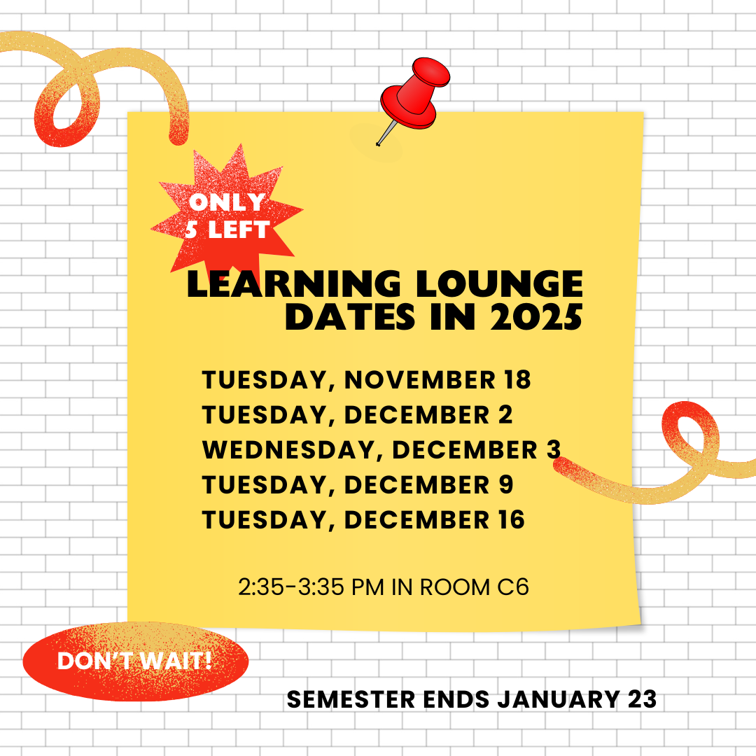Learning Lounge is open on the days listed, from 2:35pm - 3:35 pm, in Room C6. Students can ask their teacher how to sign up, or just drop by on a date listed.