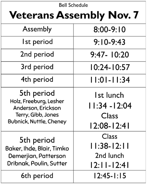 November 7 ASSEMBLY Alternative Bell Schedule:Veterans Day