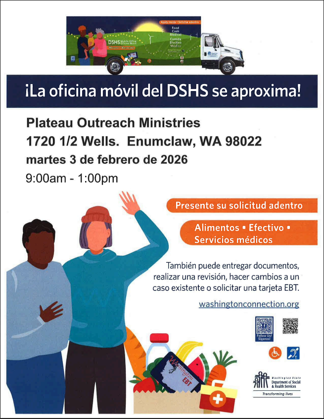 The Washington State Department of Social and Health Services (DSHS) Mobile Community Service Office is coming to Plateau Outreach Ministries on February 3, 2026 from 9:00-1:00. During this event, we will: |