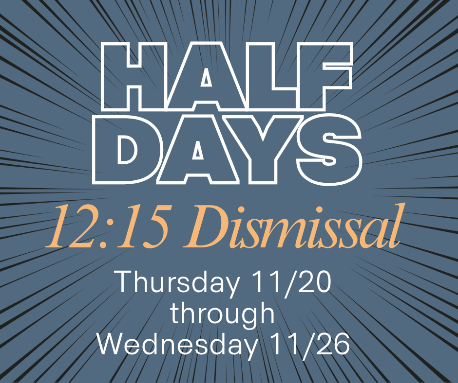 Wednesday, November 26th - Half-day, 12:15 dismissal