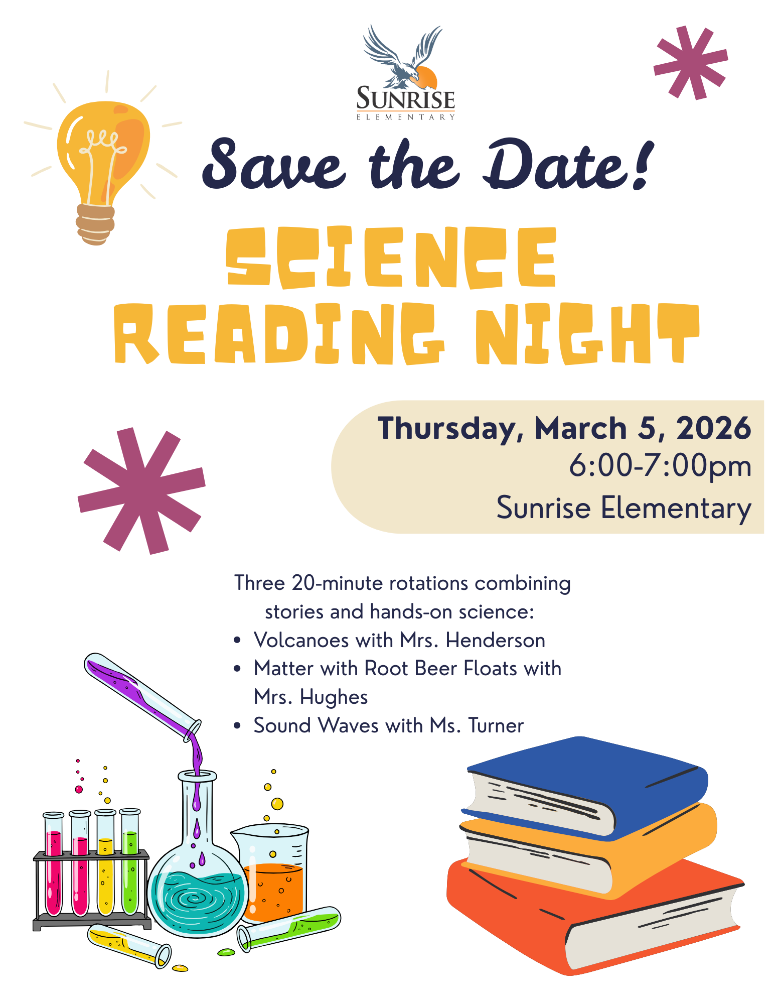 Thursday, March 5th - Family Reading Night, 6:00-7:00 Tuesday, March 10th - PTO Meeting in Sunrise Library, 4:00 Wednesday, March 11th - Class Picture Day with Dorian Friday, March 20th - Snow Make-up Day - There is school this day to make up for our canceled day on December 11th Tuesday, March 24th - 5th Grade Music Recruitment Field Trip Thursday, March 26th - Kindergarten Orientation, 5:30-6:30 Friday, April 3rd - Dancing Classrooms Culminating Event, 9:30 Tuesday, April 7th - PTO Meeting in Sunrise Library, 4:00