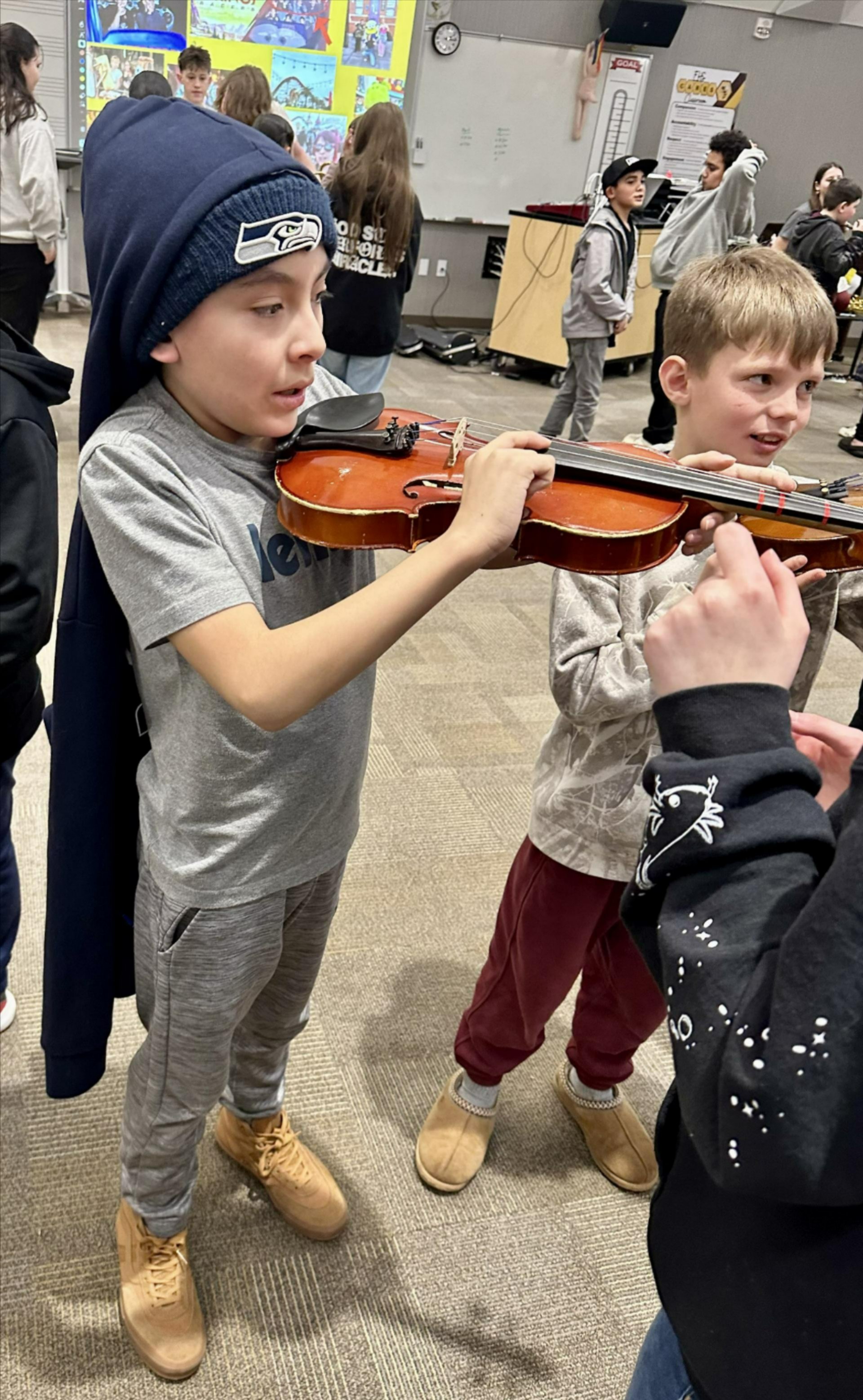 Our 5th graders (along with all other 5th graders across the district) had the opportunity to visit the high school to hear about all the different opportunities to participate in music education in middle and high school. They listened to a performance by members of the high school band, orchestra, and choir, and then participated in an instrument "petting zoo" where they got to try out different types of instruments. We heard that Sunrise definitely had some excellent wind instrument potential thanks to Ms. Turner's teaching of playing the recorders.