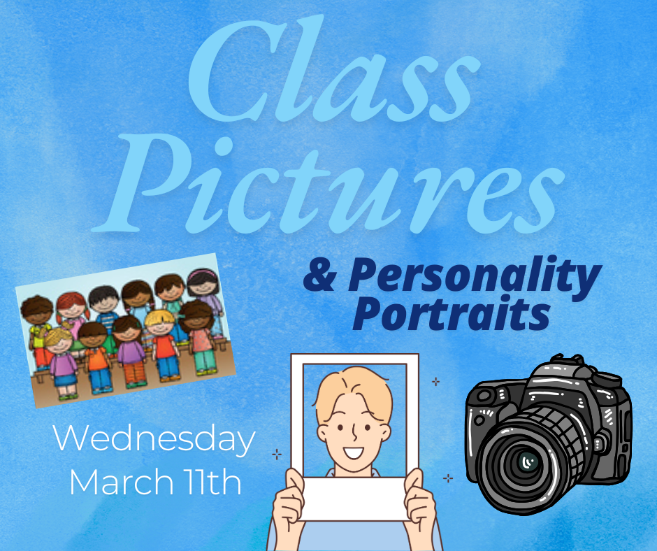 Dorian will be here again on Wednesday, March 11th to take class pictures and individual personality portraits. Every student will receive a FREE class picture. The personality portraits are completely optional, and can be ordered with the paper order form coming home with your student, or online at mydorian.com. Please note that the photographers will ONLY be taking individual photos for kids who have an order envelope in hand or who have an online order placed through the end of the day on March 10th.