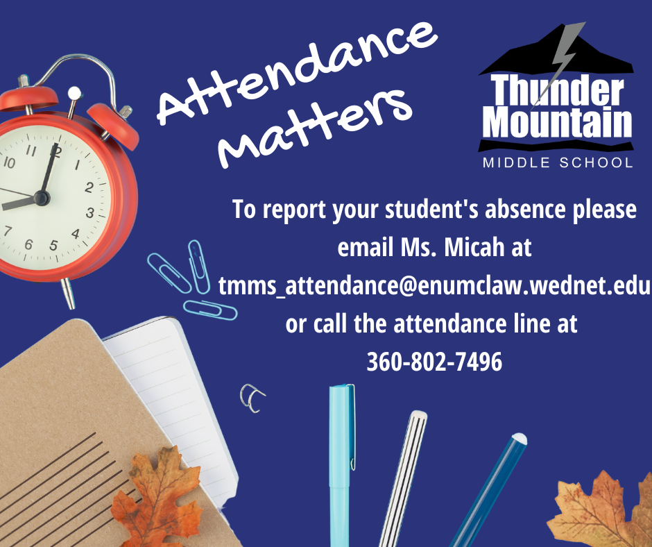 To report your student's absence please email Ms. Micah at tmms_attendance@enumclaw.wednet.edu or call the attendance line at 360-802-7496