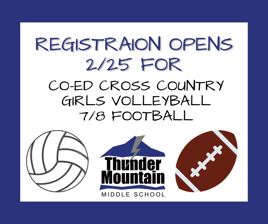 Monday, March 23rd will be the first day of practice for Cross Country and Volleyball. All forms can be found on our Thunder Mountain website under the Enumclaw School District website. Click menu, scroll down to Athletics, click Athletic Registration and follow the steps from there. https://tmms.enumclaw.wednet.edu/o/tmms/page/athletics