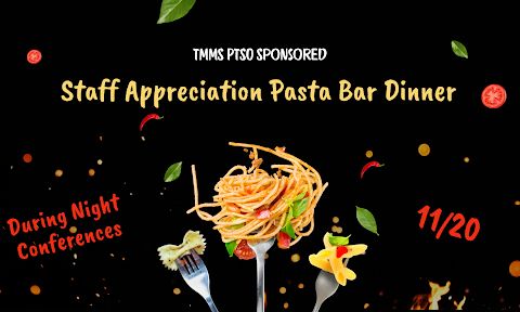 On November 20th TMMS PTSO will be feeding the staff dinner during evening conferences. Sign ups are open for the staff Pasta Bar. Sign up here to bring food or donate. https://www.mealtrain.com/potlucks/lgmlk6 |