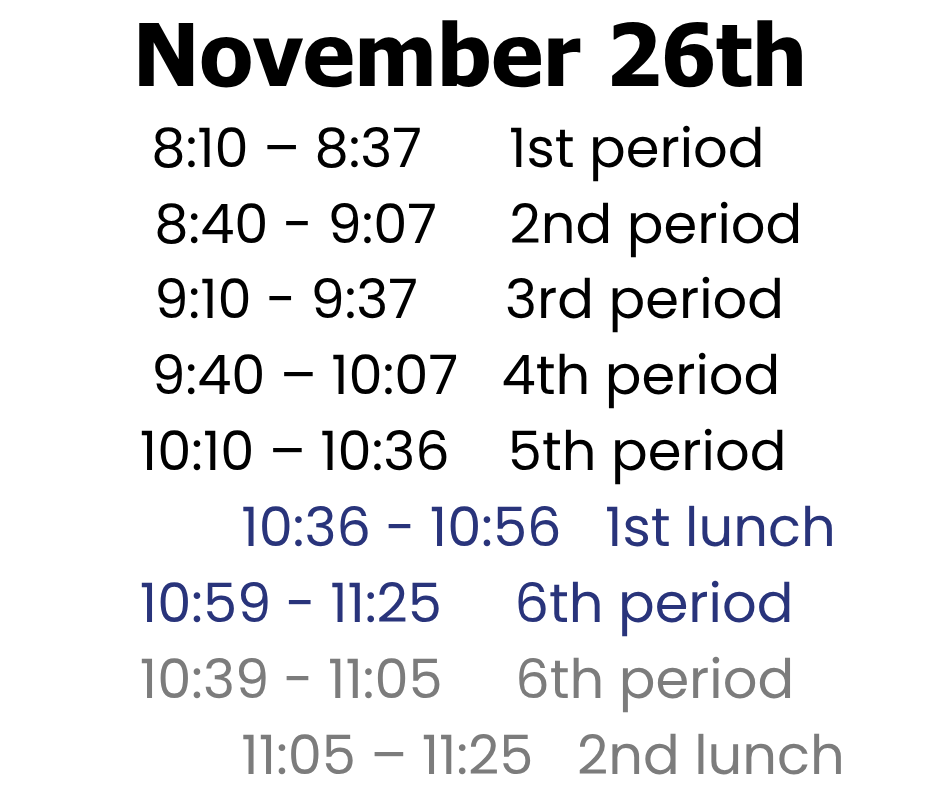 Tuesday, November 11 No School/Practice/Clubs Wednesday, November 12